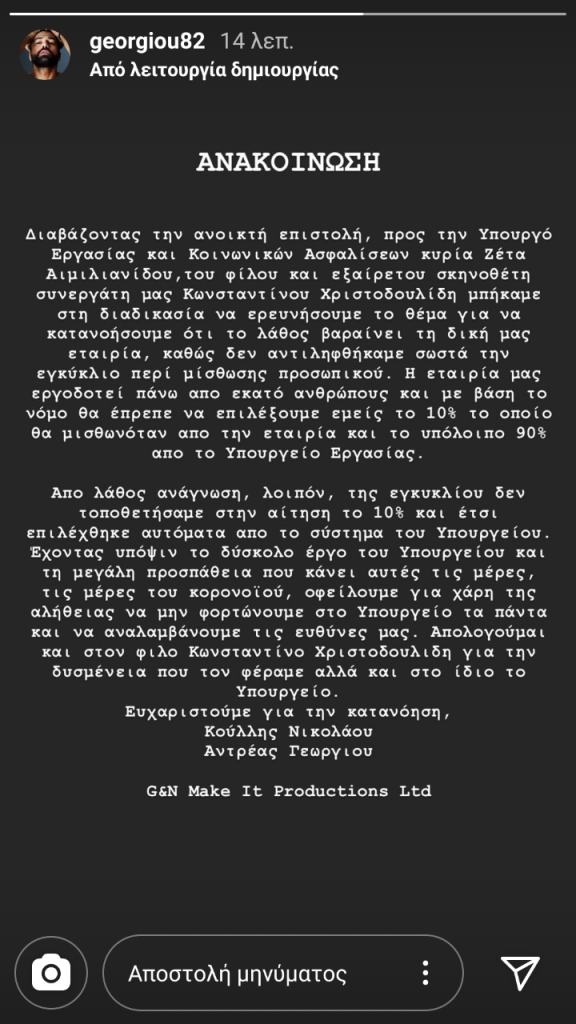Όλο το πρόβλημα ξεκίνησε από τον Κωνσταντίνο Χριστοδουλίδη ο οποίος και ζήτησε το λόγο για την αργοπορία των επιδομάτων από την Ζέτα Αιμιλιανίδου . Το λάθος όμως τελικά για την αργοπορία των επιδομάτων ήρθε από τον Ανδρέα Γεωργίου όπου η εταιρεία παραγωγής τους δεν μελέτησε σωστά την εγκύκλιο περί μίσθωσης προσωπικού . Έτσι λοιπόν ο Ανδρέας Γεωργίου απολογήθηκε στην Ζέτα Αιμιλιανίδου γράφοντας το εξής μακρόσυρτο κείμενο στο story του στο Instagram . Δείτε και τη σχετική του ανάρτηση :