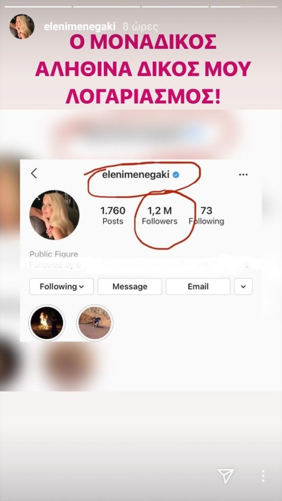 Επειδή πολλά άτομα του καλλιτεχνικού χώρου και όχι μόνο έχουν πέσει θύματα απάτης αφού κάποιοι κάνουν λογαριασμό στο όνομα τους , η Ελένη Μενεγάκη χθες θέλησε να μιλήσει για αυτό μέσα από τα stories της στο Instagram και να πει πως ανακάλυψε τους ψεύτικους λογαριασμούς που έχουν φτιαχτεί στο όνομα της . Δείτε παρακάτω το σχετικό βίντεο αλλά και τον αληθινό λογαριασμό της :