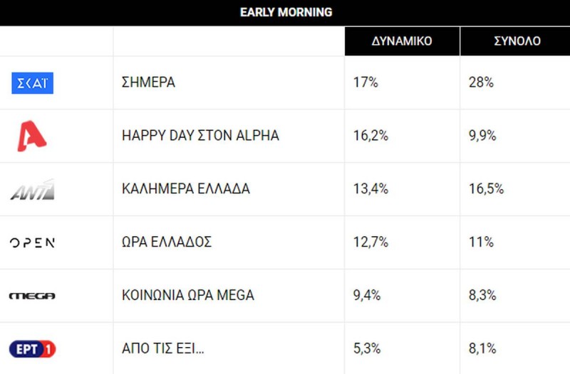 Και δεν μιλάμε για το ότι έχασε κάποιον δικό του άνθρωπο αλλά για τη τηλεθέαση αφού ο αντίπαλος του το SKAI έφτασε το 28 % και εκείνος δεν κατάφερε να ξεπεράσει το 16 % . Δείτε παρακάτω αναλυτικά και τα νούμερα τηλεθέασης :