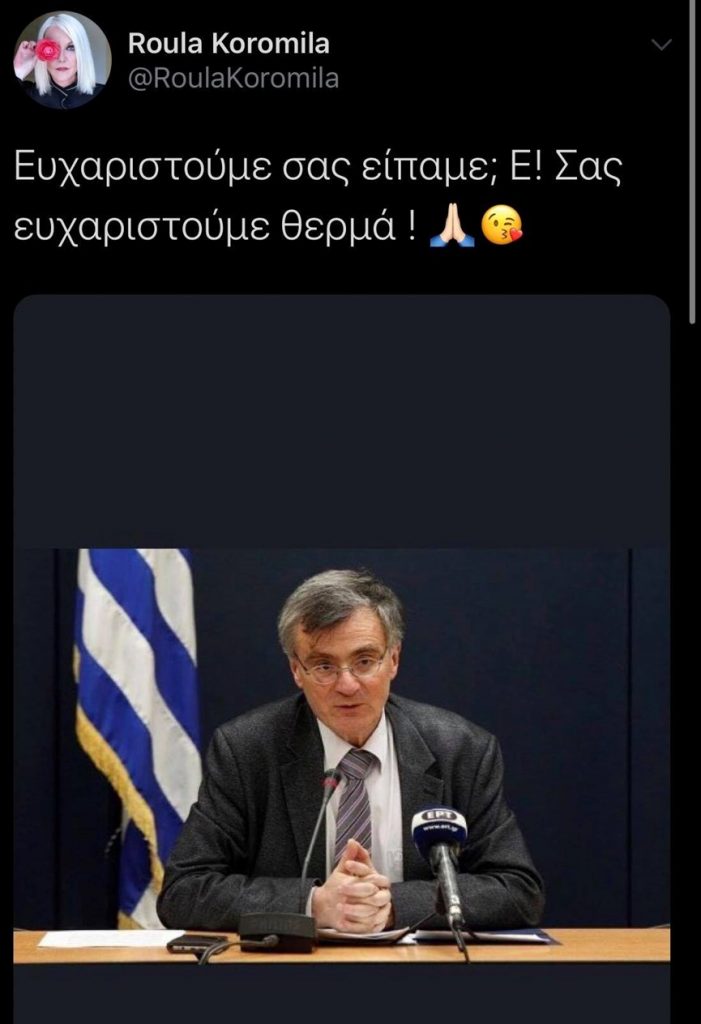 Όπως είδαμε τη Τρίτη ήταν η τελευταία ενημέρωση του Σωτήρη Τσιόδρα και του Νίκου Χαρδαλιά που επί 72 μέρες ήταν στο πλευρό όλων των Ελλήνων δίνοντας τη μάχη τους με το κορονοϊό. Η Ρούλα Κορομηλά λοιπόν θέλησε μέσα από το Twitter της να στείλε ένα δημόσιο μήνυμα προς τον Σωτήρη Τσιόδρα . Δείτε παρακάτω ποιο ήταν :