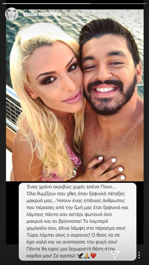 Ένας χρόνος πέρασε από το θάνατο του Πάνου Ζάρλα ο οποίος έχασε τη ζωή του στο ύψος της Συγγρού με τη μηχανή του και η Στέλλα Μιζεράκη δεν θα μπορούσε να μην αναφερθεί σε αυτό το τραγικό γεγονός καθώς διατηρούσε σχέση μαζί του μέσα στο Power Of Love όπου και γνωρίστηκαν . Η ίδια λοιπόν ανέβασε ένα μήνυμα μέσα από το Insta story της όπου ραγίζει καρδιές . Δείτε και τη σχετική της ανάρτηση :