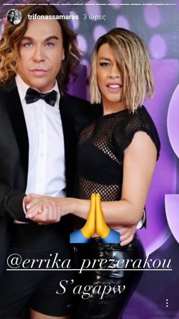 Η Έρρικα Πρεζεράκου η οποία και έπαθε χθες ένα σοβαρό ατύχημα με το σκάφος καθώς η προπέλα της έκοψε το δάχτυλο στο δεξί της χέρι , έχει συγκινήσει συγγενείς , γνωστούς και φίλους . Μάλιστα ο συμπαίκτης της Τρύφωνας Σαμαράς από το Just the 2 Of us , έστειλε το δικό του μήνυμα στήριξης μέσα από το insta story του . Δείτε το και στη παρακάτω ανάρτηση :